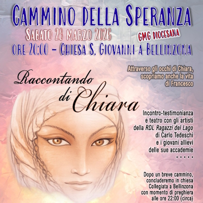 La GMG diocesana vi invita tutti quanti (età scuola media, adolescenti e giovani dai 14 ai 17 anni, animatori dei GREST e delle colonie estive) ad un momento di preghiera, condivisione, amicizia e formazione: “Il Cammino della Speranza“, sabato 28.03.2026 alle ore 20:00 alla Chiesa di S. Giovanni a Bellinzona.